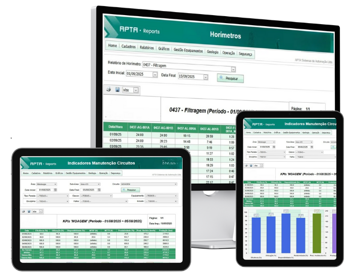 O APTA DASHBOARDS atua como extensão natural do APTA REPORTS, transformando dados em visualizações dinâmicas e intuitivas. Com ele, sua equipe de gestão e manutenção acompanha indicadores em tempo real, cria ambientes colaborativos e recebe notificações automáticas em caso de desvios de performance.