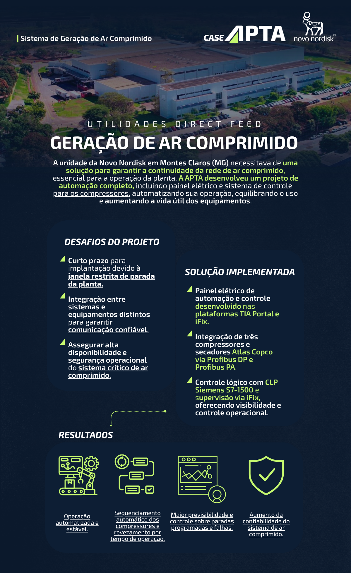 A unidade da Novo Nordisk, em Montes Claros (MG), demandava uma solução confiável para garantir a disponibilidade contínua da rede de ar comprimido em sua área de utilidades, um sistema crítico para a operação da planta. Para atender a essa necessidade, a APTA desenvolveu um projeto completo de automação, contemplando o fornecimento de painel elétrico e a implementação de um sistema de controle para gerenciamento automático da operação dos compressores.